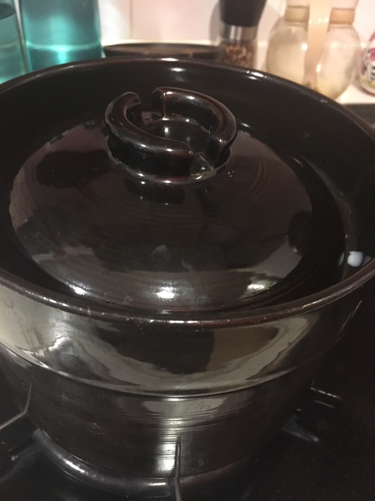 ③それを土鍋の中で混ぜ合わせ、一分加熱します。このとき、普通のお鍋ではなく必ず土鍋を使用しましょう。ヨーグルトのタネが発酵するのに土鍋が最適です。たぶん、菌が呼吸できるのかな?