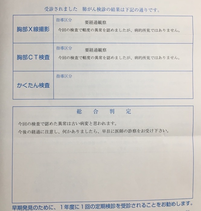 なぜならば、以前ものすごい咳喘息発作を起こして以来、肺がん検査をすると病変の跡があるという結果になってしまうからです。