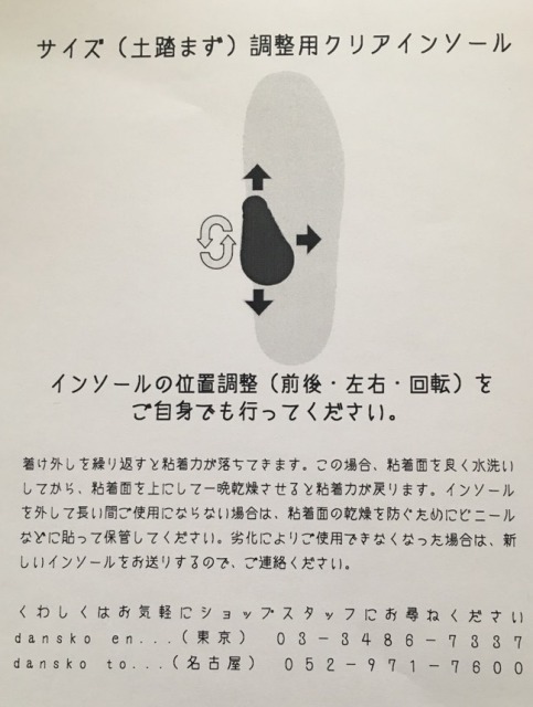 店長さんの見立てで、私の土踏まずが靴下の重ねばきで後方にずれているので、透明なインソールをサービスでつけてくださいました。