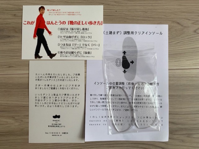 透明のインソールがおまけで入っていました。それと、ダンスコの店長さんが書いている正しい靴の履き方のご案内です。(こちらはアマゾンプライム会員であれば無料で読むことができます。)