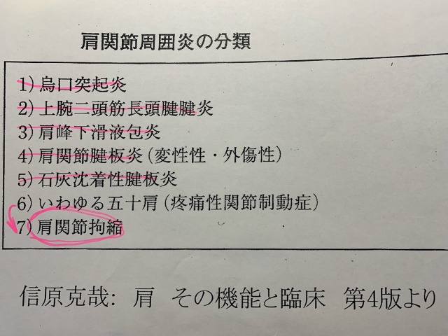 先生の診断はこちらでした。骨や筋肉に問題がないので、6の五十肩からの7の肩関節拘縮ということになりました。
