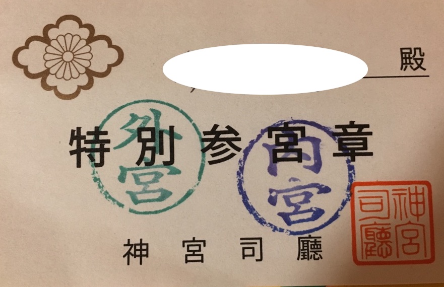 このような特別参宮章を発行してくれます。これを外宮、内宮ともに神官詰所で見せて、記帳して参拝します。
