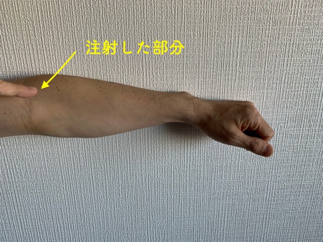 夫に痛みは肘から上の部分だったのですが、指を指している部分の方が悪いということでこの部分に注射しました。その注射した部分がまだ痛いらしいのですが、以前腕をまげたときに起こっていた痛みはとれているという不思議な現象が起こっています。