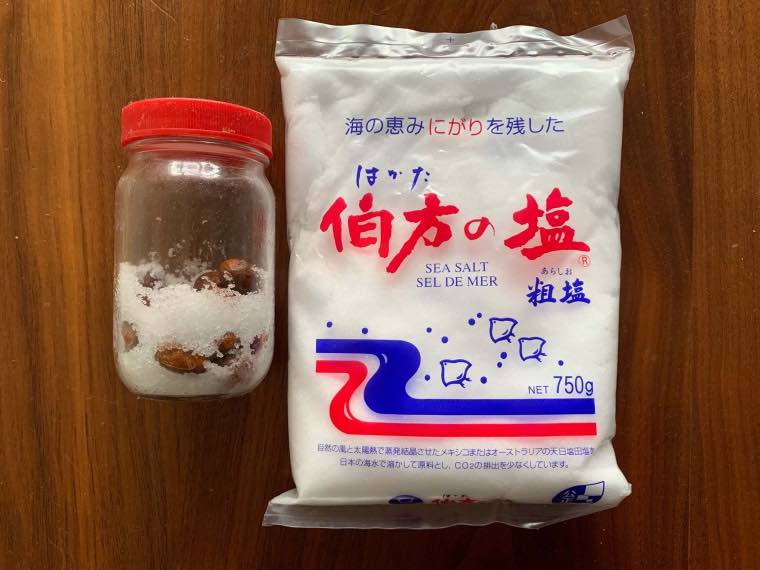 - きれいなびんを準備して、10パーセントくらいの自然塩をまぶして、しっかり保存する。