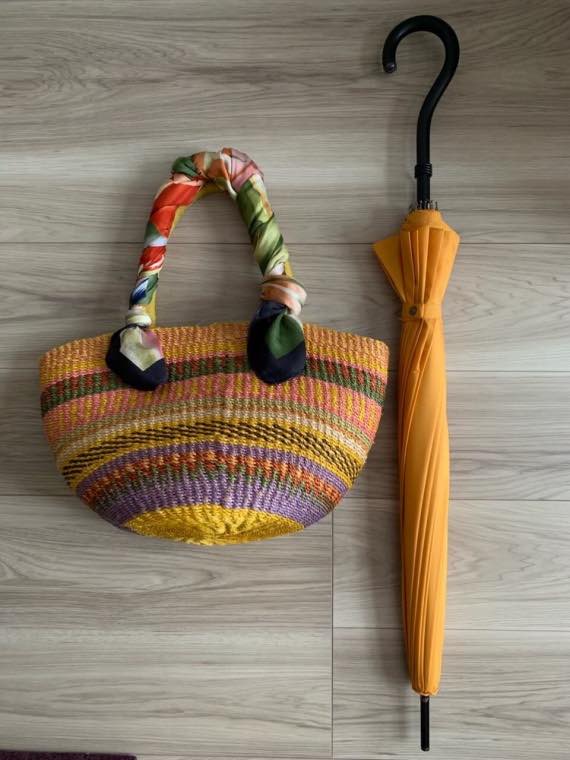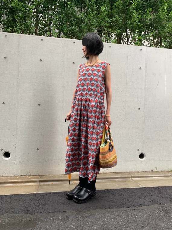 ワンピースの派手な柄とカラフルなカバンと傘で重い重ねばきの足元が緩和されていると自分では思っています。