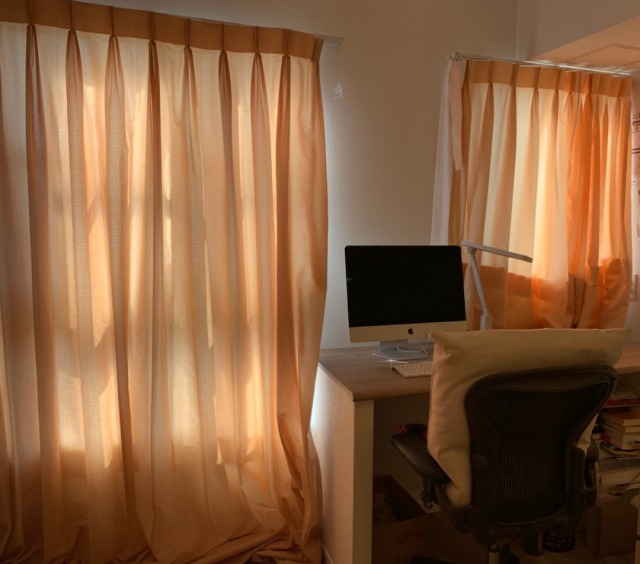 なんと、住み替え前の家のカーテンを使っていました。丈が長すぎてまつり縫いするというお粗末なコーデです。