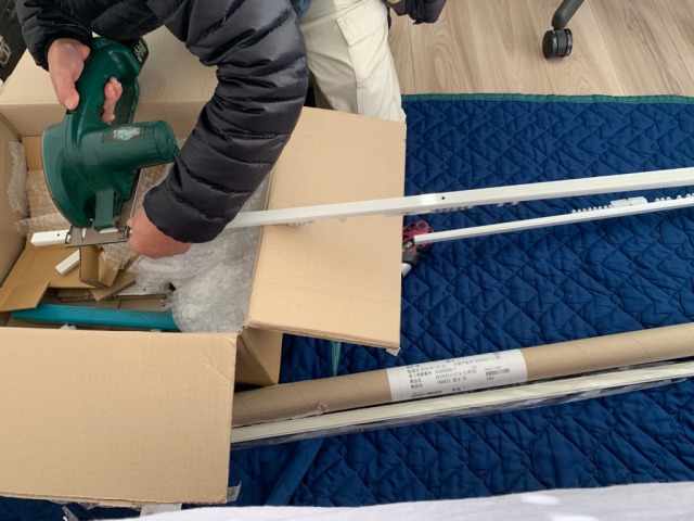 まず赤丸のカーテンレールを取り外します。職人さんに窓の大きさに合わせてレールをカットしてもらいました。使用するのは電動ノコギリであっという間にカットできました。