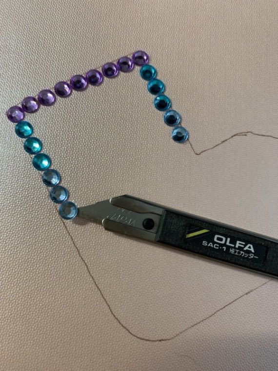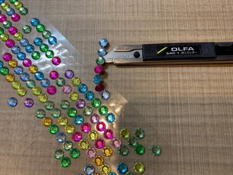 一つ一つ切り離したジュエリーシールをカッターの刃に乗せたまま、下書き線の上に仮に置いていきます。